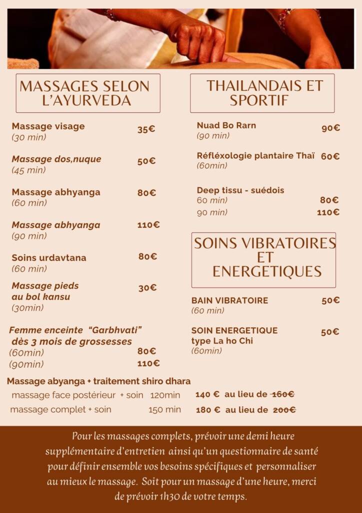 Contradictoirement ce soin est plus court mais nous utilisons bien plus d’huile (1litre entier) de lait (1.5l), de farine de blé ou petit épeautre… et de manutention que pour un massage de tout le corps.  Il génère surtout du matériel onéreux acheté directement à la source soit en Inde. Ce prix inclue donc la formation couteuse, le savoir-faire précis et l’authenticité comme si vous étiez en Inde (pour ma part Nord de l’Inde et non pas le Kerala) afin de vous garantir une efficacité maximale.